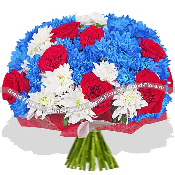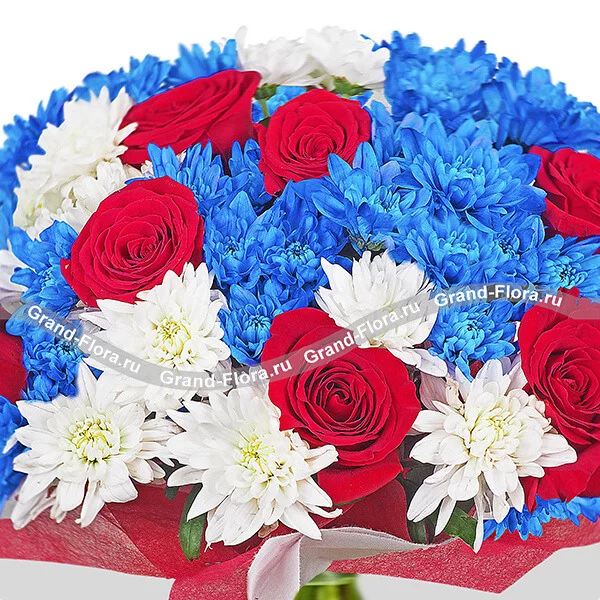 Стандартный (на фото): роза красная - 7 шт, хризантема кустовая белая - 3 шт, хризантема кустовая синяя - 2 шт, фетр красный.