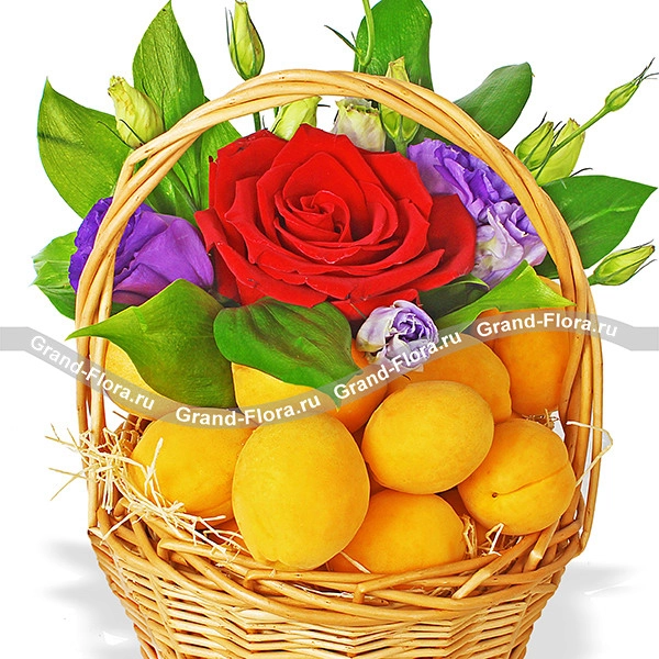 Стандартный: роза красная - 1 шт., эустома фиолетовая - 2 шт., рускус - 2 шт., оазис, корзина малая, абрикоса - 1,5 кг.