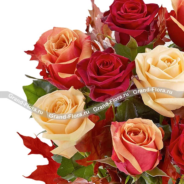 9 роз: Подарочный сертификат магазина Летуаль на сумму 2000р., роза красная - 4 шт.(70см), роза оранжевая - 3 шт.(70см), роза кремовая - 2 шт.(70см), Декор - осенние листья.