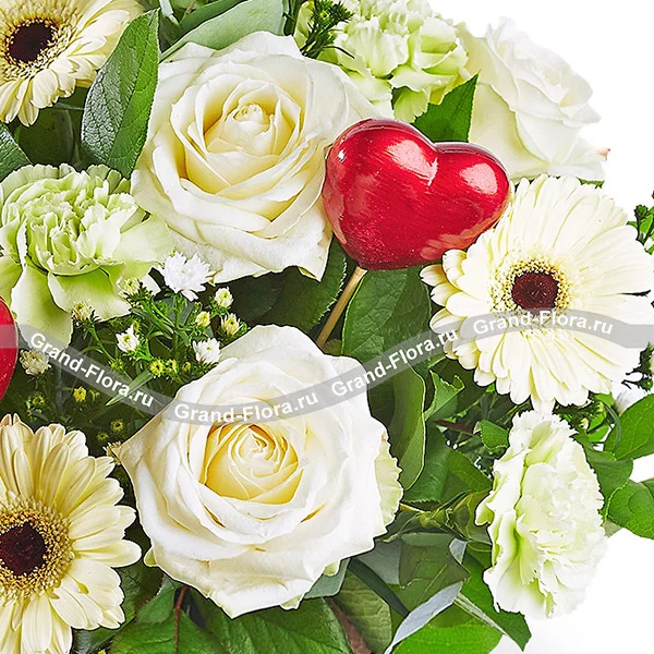 Люкс: роза белая - 7 шт., гербера кремовая - 5 шт., гвоздика зеленая - 3 шт., рускус - 2 шт., гипсофила - 1 шт., эвкалипт - 2 шт., сердце красное (декоративное) - 3 шт., упаковка, бант красный. Примерный размер: 35Х35 см.