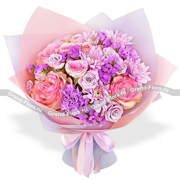 Букет выполнен из роз нежно – розовых и фиолетовых оттенков, кустовой хризантемы сиреневого оттенка и гвоздики в тон композиции, финальные аккорды статицы, в окружении невесомого розово – фиолетового фетра и ленты, завершают букет, делая его изысканным и элегантным. Букет составляет от 30см в высоту, а диаметр от 20см до 35см, в зависимости от выбранного Вами варианта. Обращаем Ваше внимание, что состав и оформление букета могут отличаться.