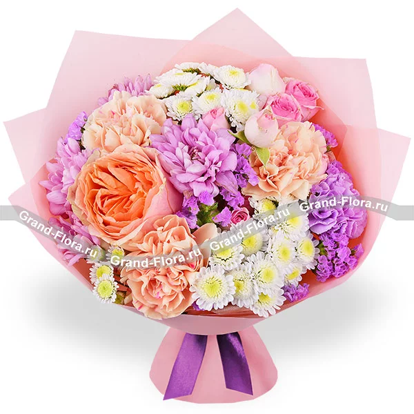 Стандартный: роза персиковая - 2 шт.,гвоздика персиковая - 5 шт., гвоздика фиолетовая - 2 шт., роза кустовая розовая - 2 шт., роза кустовая фиолетовая - 2 шт., хризантема кустовая ромашковая фиолетовая - 2 шт., хризантема сантини - 2 шт., статица, упаковка, лента. Примерный размер: 35Х35 см.